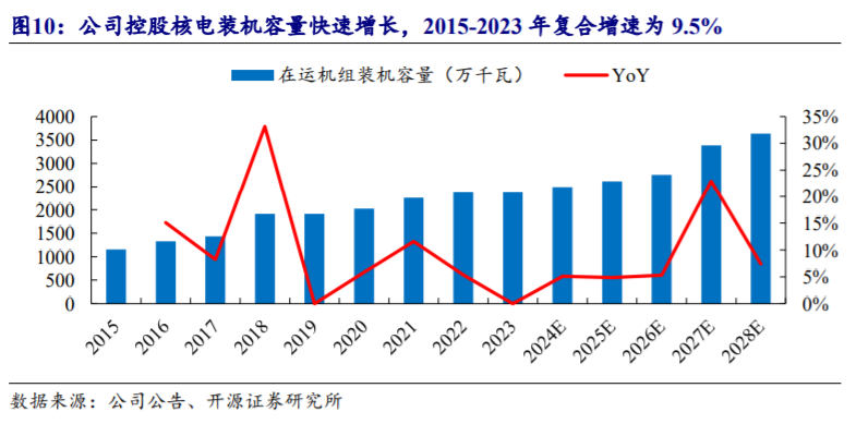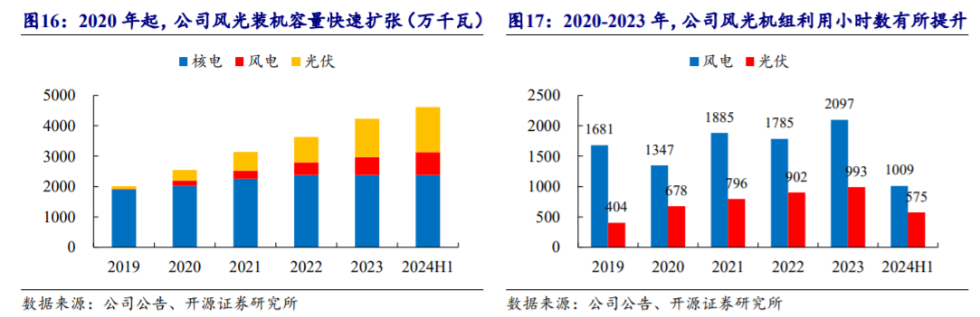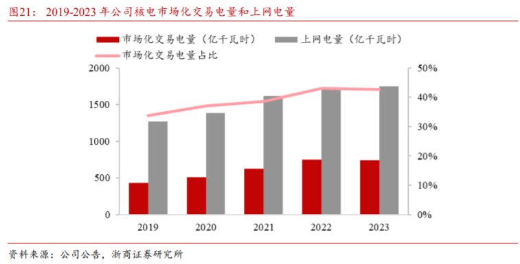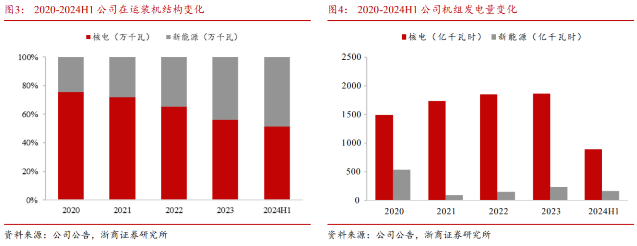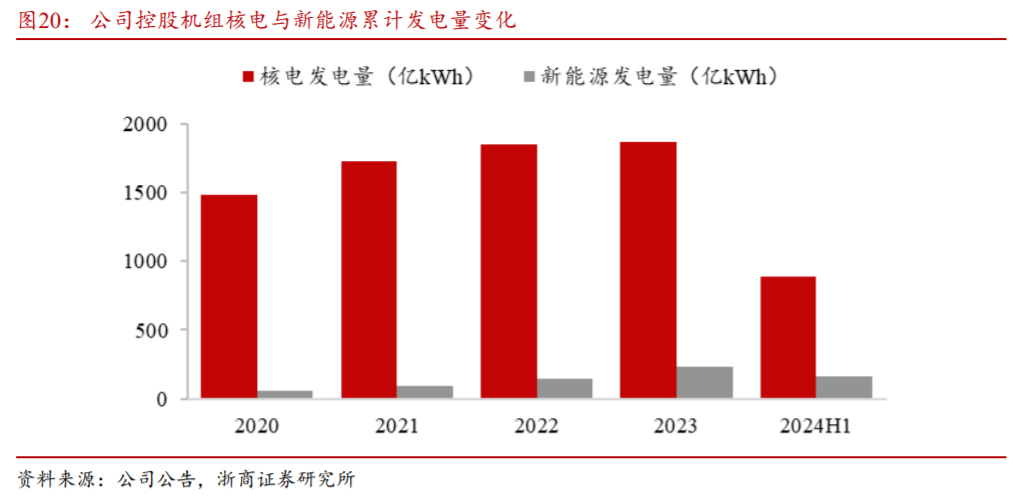 核电+新能源双轮驱动,市场化交易推动核电收入增长。截至2024年上半年,公司核电控股在运装机容量2,375.00万千瓦,另有15台核准、在建核电机组;此外公司非核清洁能源在运在建装机突破3600万千瓦,在建新能源项目数量超过130个。当前公司沿海核电基地项目目前正在规划中,已经进入规划的有37个厂址,预计还能推动3~5个厂址纳入规划;未来公司有望保障每年4~6台机组具备核准条件,资源较为充足。近年来公司核电深入参与市场化交易,其核电2019年至2023年市场化交易电量占总上网电量比例由33.71%提高至42.65%,综合电价则保持稳定。公司近年来持续推进非核清洁能源开发工作,预计2025年新能源发电量将继续快速增加,与此同时公司立足核能综合利用,有序推进“核能+战略新兴产业”发展,研究探索新业态,积极发展核能供热、供汽等核能多用途利用以及同位素、钙钛矿等战略性新兴产业。