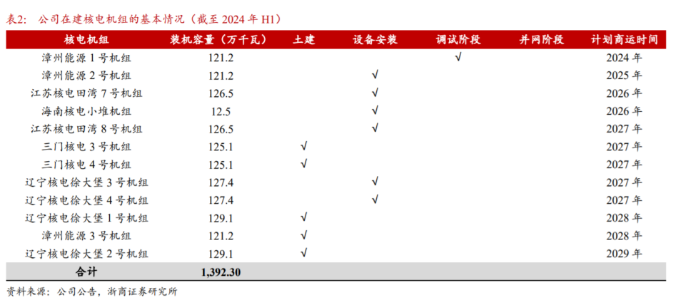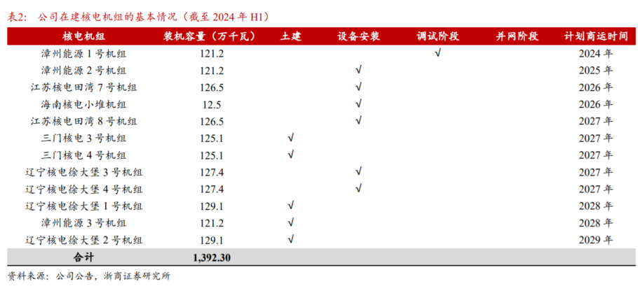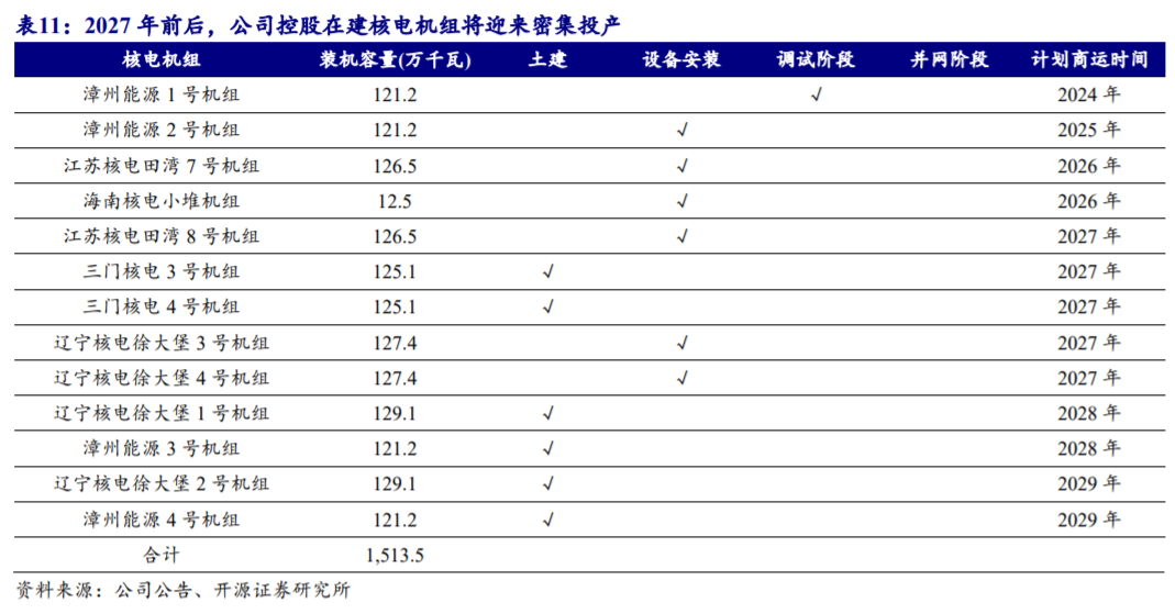 24年资本开支大幅提升,140亿定增助力项目建设。去年公司发布2024年投资计划1215.53亿元,同比+52%,主要用于核电、核能多用途、新能源、单项固定资产投资项目和参控股资本金注入、收购项目等。公司预计2025-2027年分别投产1、2、5台核电机组,期待核电机组有序投产带动业绩持续增长。根据公告,公司于2025年1月10日完成向特定对象发行A股股票,中核集团、社保基金会以现金方式一次性全额认购本次发行的A股股票,发行数量为1,684,717,207股,发行价格为8.31元/股,在扣除发行费用后将全部用于核电站项目建设,具体包括辽宁徐大堡核电站1~4号机组项目,福建漳州核电站3、4号机组项目以及江苏田湾核电站7、8号机组项目,将有助于项目顺利推进和早日投产。
