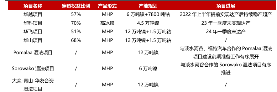 公司子公司华越镍钴、华科公司、华飞镍钴为公司上游镍金属主要生产单位,华越、华飞项目持续稳产超产。2018年,公司启动了印尼红土镍矿资源开发,并逐步推进印尼镍资源项目布局。首先是2018年公司启动首个项目印尼华越年产6万吨镍金属量氢氧化镍钴湿法冶炼项目,华越项目自2022年上半年提前实现达产后持续稳产超产,目前公司持股比例57%;其次是2020年5月公司启动华科年产4.5万吨镍金属量高冰镍项目,华科项目全流程于2022年四季度投料试产,并于23年一季度末基本实现达产,目前公司持股比例70%;然后是2021年5月公司启动华飞公司年产12万吨镍金属量氢氧化镍钴湿法冶炼项目,华飞项目于24年一季度末达产,目前公司持股比例51%。2025年,年产12万吨镍金属量的Pomalaa湿法项目开工建设,年产6万吨镍金属量的Sorowako湿法项目前期准备工作有序推进,波马拉园区展开建设。伴随Pomalaa湿法项目和Sorowako湿法项目建设投产,公司湿法镍产能实现翻倍。25H1湿法镍项目MHP出货量约12万吨,同比增长超40%,镍产品出货量13.94万吨,同比增长83.91%。