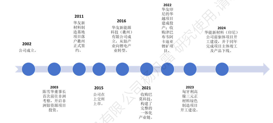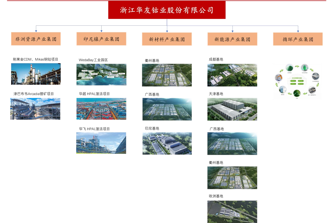 浙江华友钴业股份有限公司成立于2002年,是一家从事新能源锂电材料和钴新材料研发、制造的高新技术企业。经过二十多年的发展,公司完成了总部在浙江、资源保障在境外、制造基地在中国、市场在全球的空间布局;打造了新能源产业、新材料产业、印尼镍产业、非洲资源产业以及循环产业五大事业板块。构建了镍钴锂资源开发、有色金属绿色精炼、锂电材料研发制造、资源回收利用的新能源锂电材料全产业链。