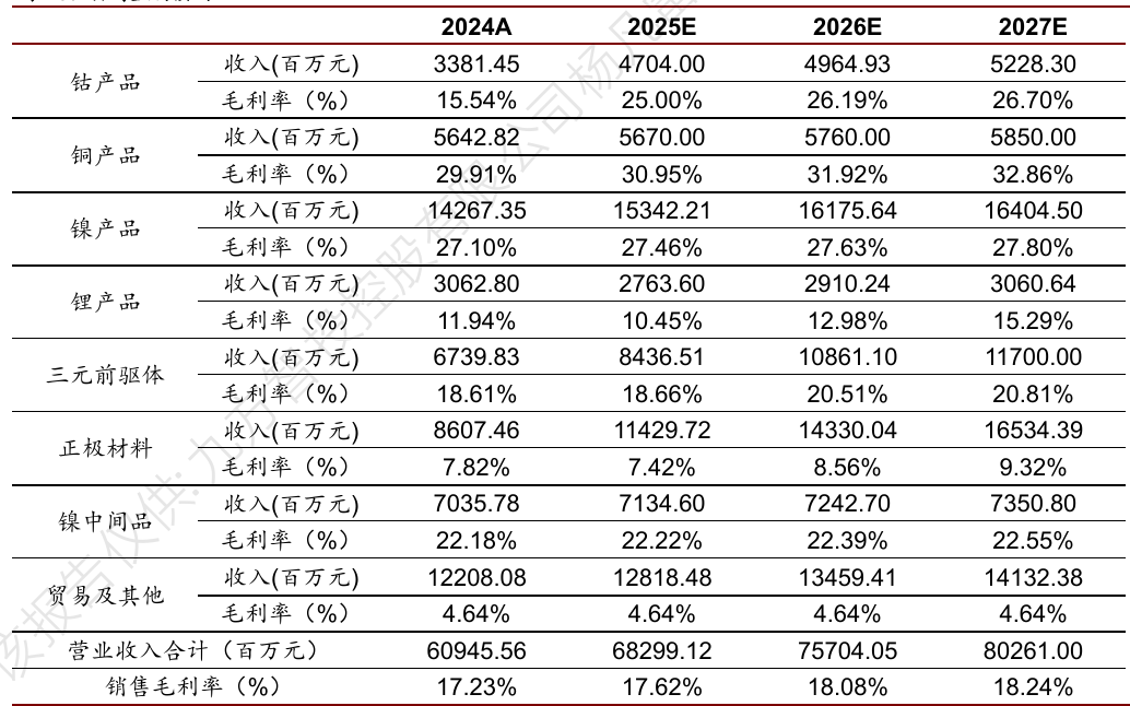 锂电和电池前驱动业务:公司通过自建及合资两种途径,稳步推进三元前驱体产能扩建。目前,公司三元前驱体项目建设主要落地华友衢州、广西玉林和浙江桐乡。2018年公司与LG化学合资成立华金公司布局前驱体项目,通过控股企业华友新能源持股华金公司51%股权,华友钴业实际权益占比20.51%;与浦项公司合资成立华浦公司,通过华友新能源持股60%,华友钴业实际权益占比24.14%。公司三元前驱体产能的扩建将在近年得到释放,产能将有较大幅度的增长。公司通过收购正极材料头部企业天津巴莫,快速切入三元正极材料市场,于广西进行一体化项目投资,进一步压降各环节成本,提升正极材料毛利率。公司通过可转债募资,由全资子公司广西巴莫建设“年产5万吨(金属量)高纯电池级硫酸镍生产线、年产10万吨高镍型动力电池用三元前驱体材料生产线和年产5万吨高镍型动力电池用三元正极材料生产线”,预计项目内部收益率为20.18%,预计投资回收期(含2年建设期)为6.49年,达产后可新增5万吨高镍型动力电池三元正极材料产能。