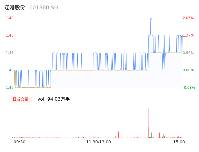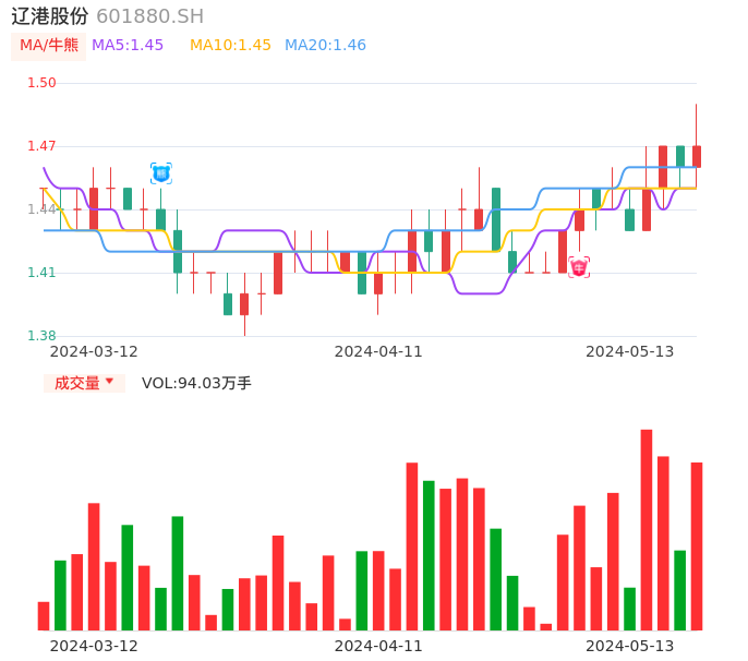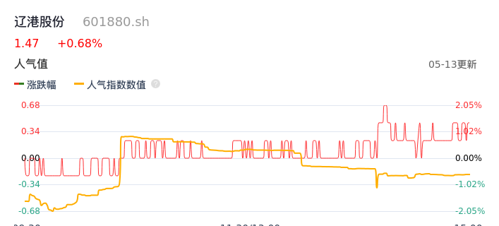 05月13日,辽港股份收报1.47,股价涨幅0.68%,成交金额1.38亿元,换手率0.50%。