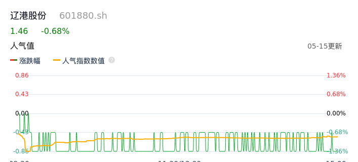 05月15日,辽港股份收报1.46,股价涨幅-0.68%,成交金额4382.19万元,换手率0.16%。