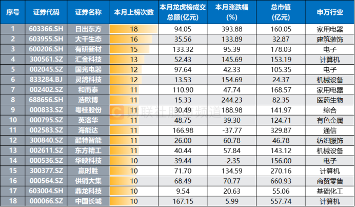具体标的来看,以11月期间登上龙虎榜的个股统计,日出东方、大千生态、有研新材、汇金科技、国光电器、灵鸽科技等股登榜次数相对较多。其中,人气股日出东方以15次涨停成为11月的“涨停王”,大千生态也录得11次涨停,股价同样高度活跃。而在这些频频登上龙虎榜的个股中,不乏有知名游资身影出现,并成为市场时下多个热炒题材的主力资金之一。