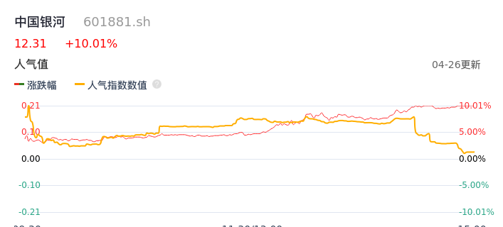 04月26日,中国银河收报12.31,股价涨幅10.01%,成交金额24.80亿元,换手率2.87%。