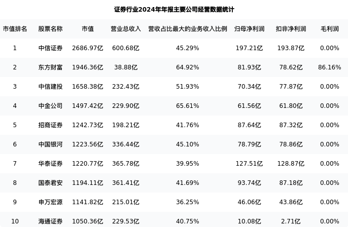 中国银河最新报告期数据为年报,下表汇总了证券行业内市值靠前的公司年报主要经营数据