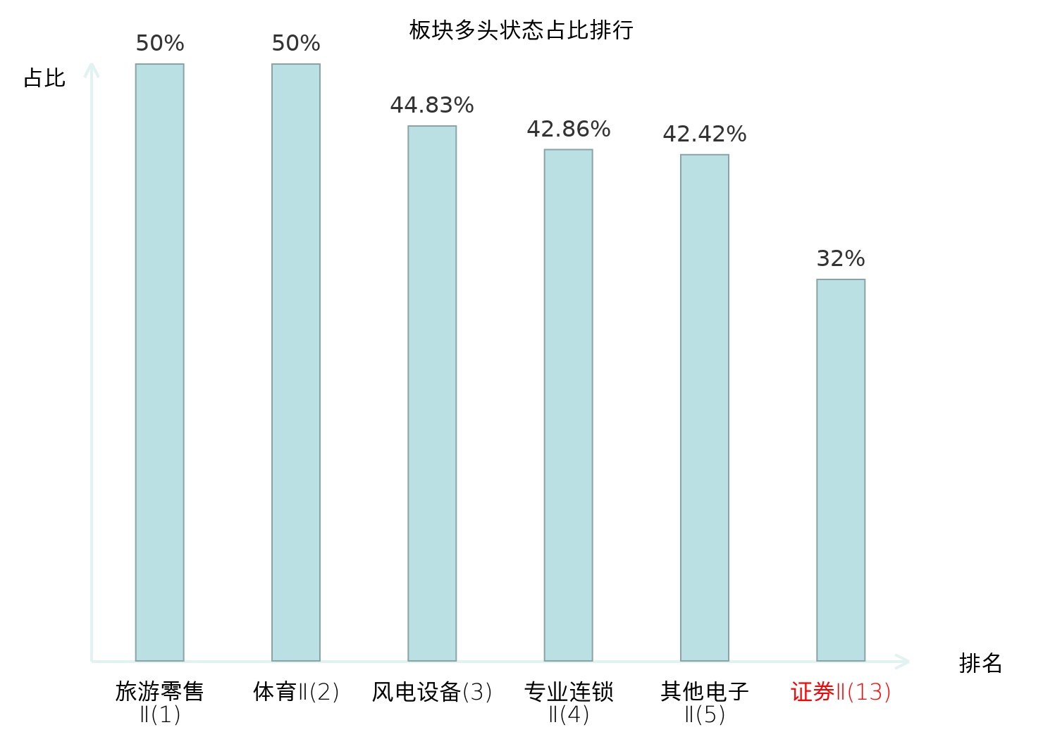 全市场所有行业板块中主力多头状态占比排名中,旅游零售Ⅱ板块位居第一。化妆品板块名次提升最快,较昨日上升66位。