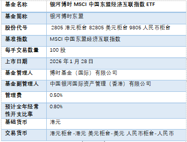 “银河博时东盟ETF”以 MSCI 中国东盟经济互联指数为投资基准,创新采用“经济暴露因子”筛选机制——通过统计“港股通”上市公司在东盟各国的收入占比,及东盟上市公司在中国内地与香港的收入占比,选取排名前 50% 的优质标的构建投资组合。产品兼具价值与成长属性,根据MSCI截至2025年末的数据,产品中代表“新质生产力”的可选消费、信息技术、通信的相关股票市值占比近35%、金融相关股票市值占比近35%,融合了两大市场产业互补优势。在交易设计上,产品支持港元、美元、人民币三种货币柜台交易,为全球投资者提供低成本、高便捷度的资产配置工具。