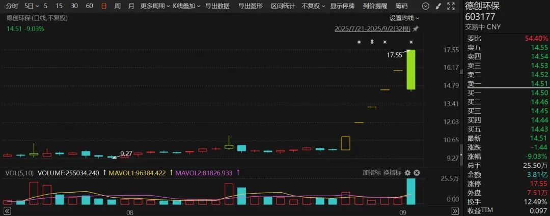 个股方面,德创环保(603177)开盘后快速下跌触及跌停,上演“天地板”行情。该股此前走出5连板,今早继续以涨停价开盘。