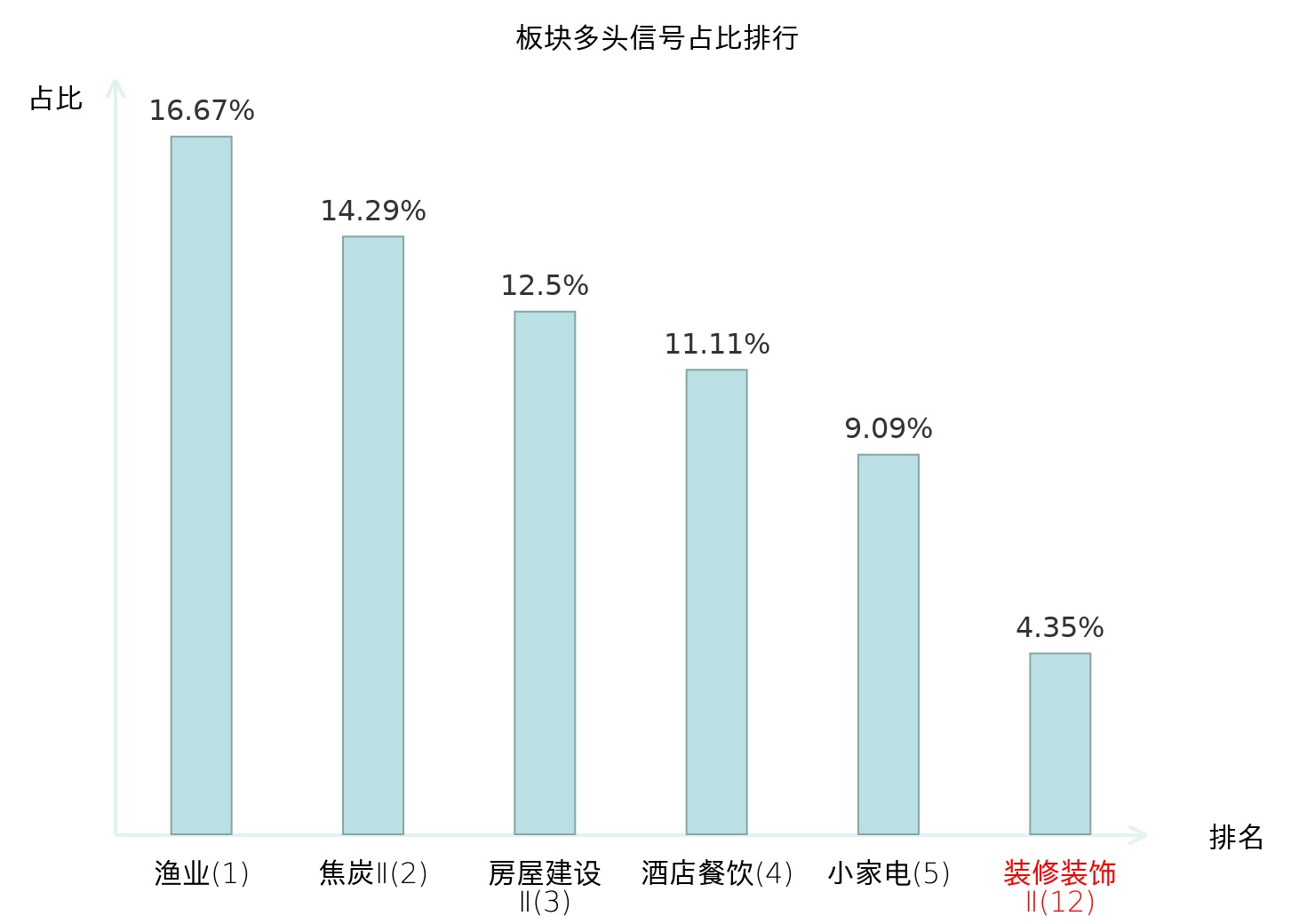 全市场所有行业板块中主力多头信号占比排名中,渔业板块位居第一。渔业板块名次提升最快,较昨日上升121位。