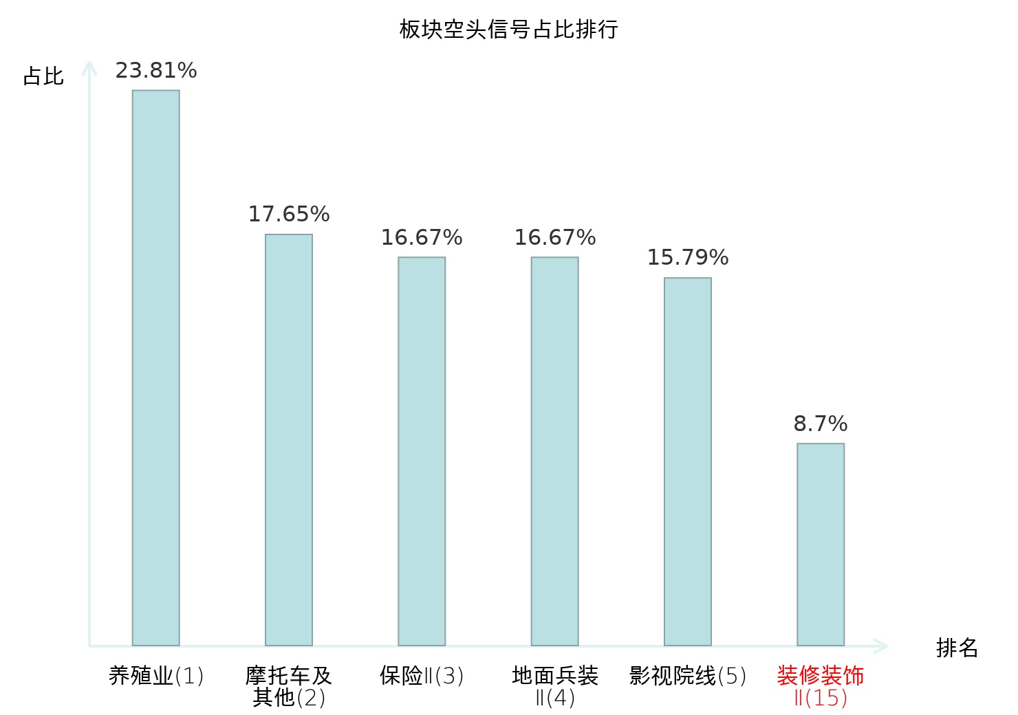 全市场所有行业板块中主力空头信号占比排名中,养殖业板块位居第一。养殖业板块名次提升最快,较昨日上升114位。
