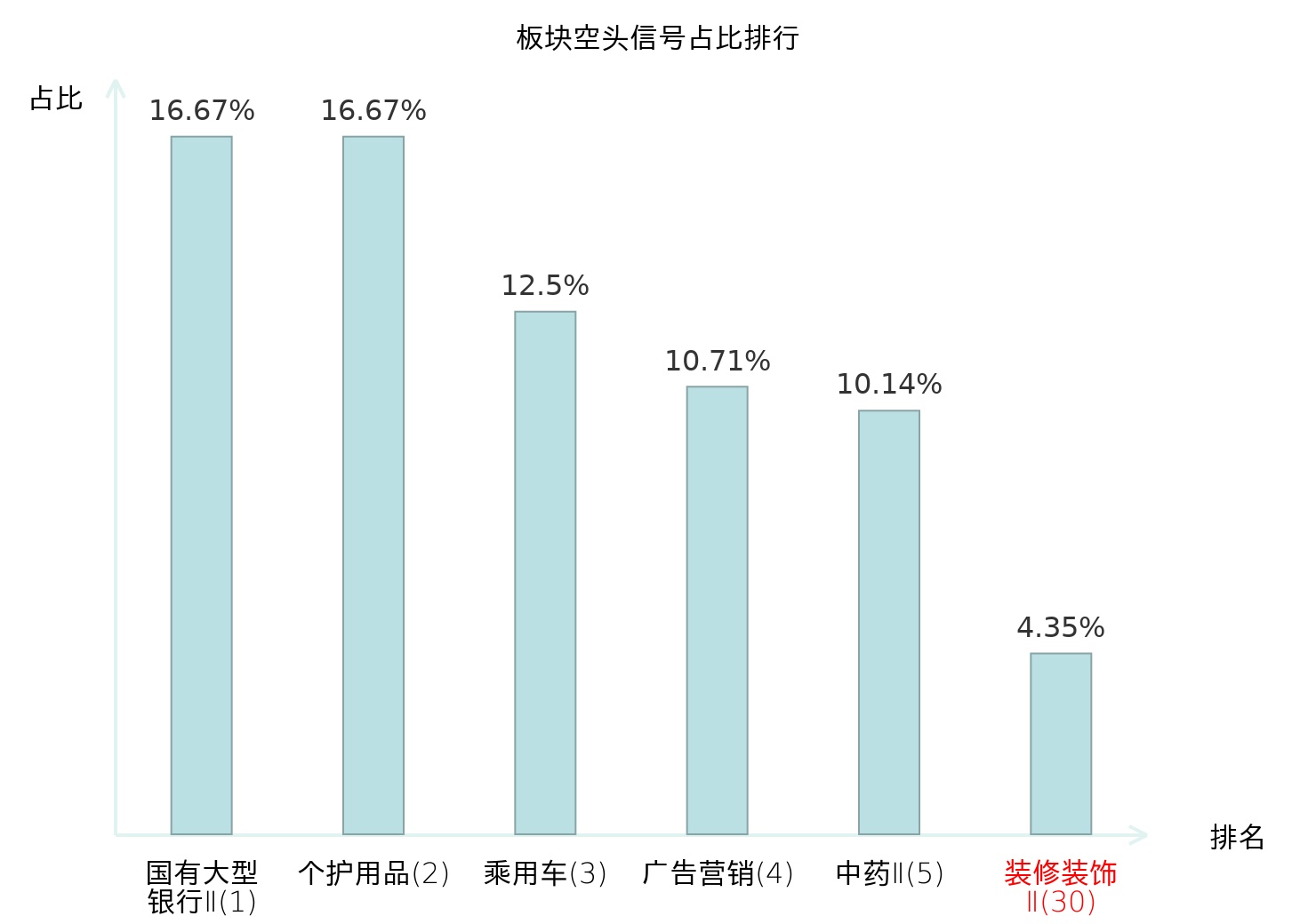 全市场所有行业板块中主力空头信号占比排名中,国有大型银行Ⅱ板块位居第一。医疗服务板块名次提升最快,较昨日上升110位。