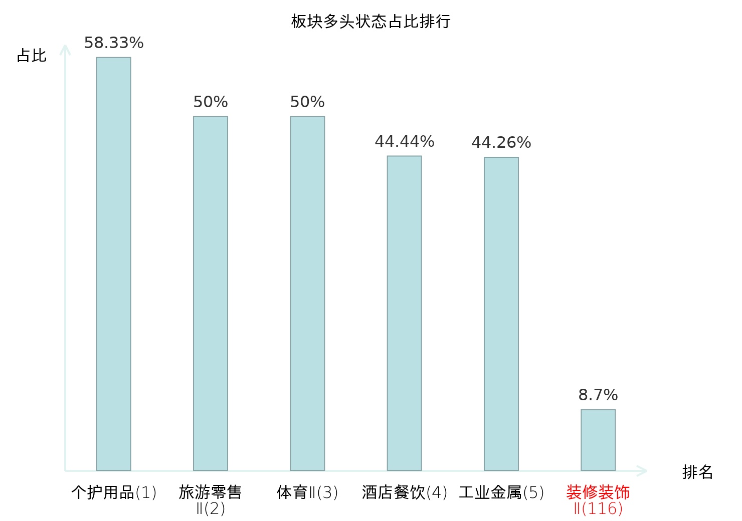 全市场所有行业板块中主力多头状态占比排名中,个护用品板块位居第一。非白酒板块名次提升最快,较昨日上升65位。