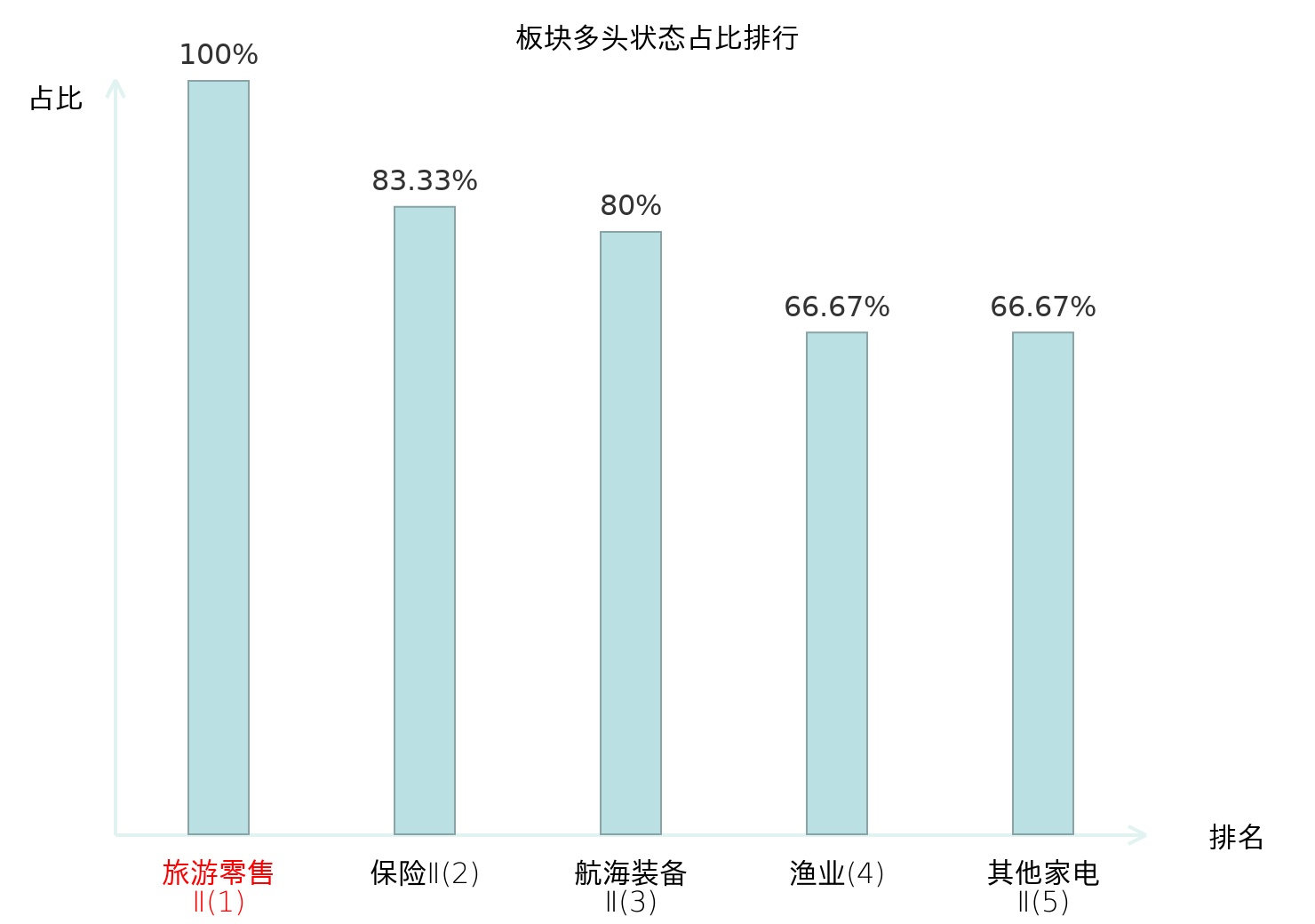 全市场所有行业板块中主力多头状态占比排名中,旅游零售Ⅱ板块位居第一。证券Ⅱ板块名次提升最快,较昨日上升106位。