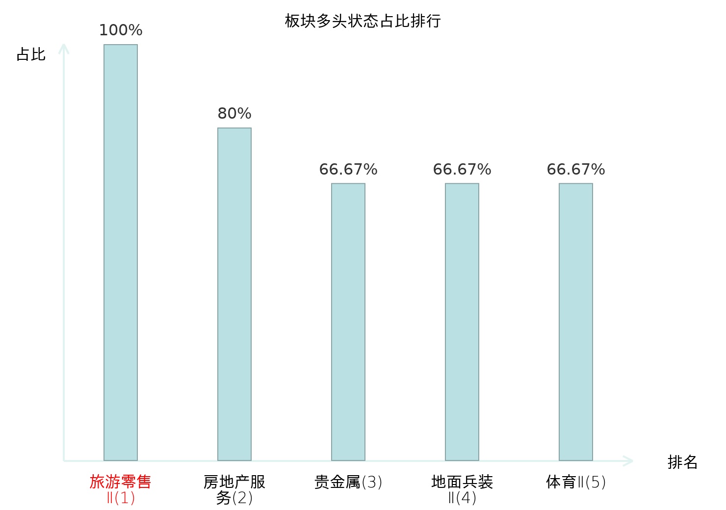 全市场所有行业板块中主力多头状态占比排名中,旅游零售Ⅱ板块位居第一。个护用品板块名次提升最快,较昨日上升70位。