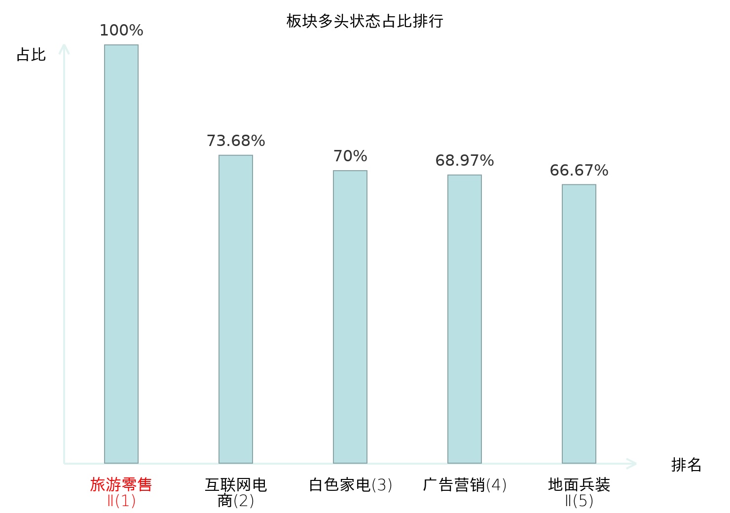 全市场所有行业板块中主力多头状态占比排名中,旅游零售Ⅱ板块位居第一。厨卫电器板块名次提升最快,较昨日上升76位。