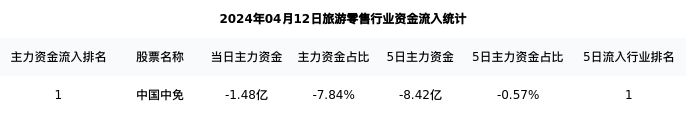 中国中免今日净流出1.48亿元,主力占比7.84%,在行业内排名:1/1;5日净流出8.42亿元,主力占比0.57%,在行业内排名:1/1。
