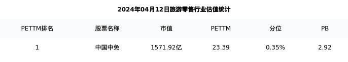 从估值角度看:中国中免最新市盈率PETTM为23.39,在行业内排名1/1,处于0.35分位。