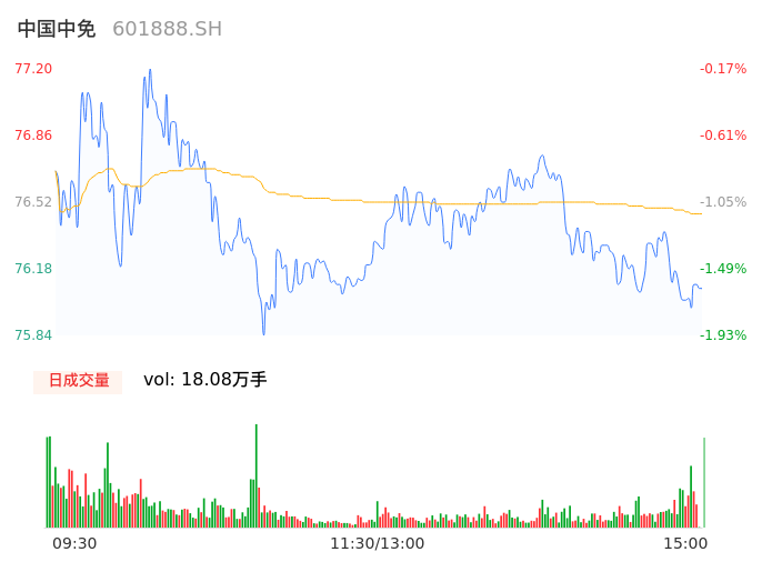 04月16日,中国中免收报75.85,股价涨幅-1.91%,成交金额13.82亿元,换手率0.93%。