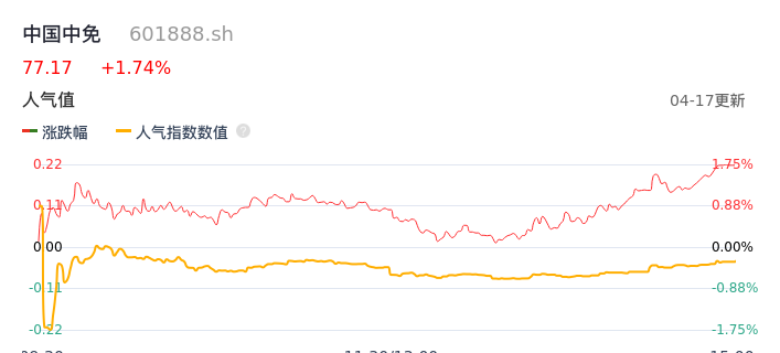 04月17日,中国中免收报77.17,股价涨幅1.74%,成交金额16.76亿元,换手率1.12%。