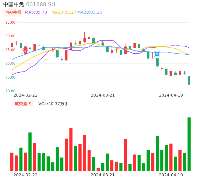 04月19日,中国中免收报72.35,股价涨幅-5.31%,成交金额29.51亿元,换手率2.07%。