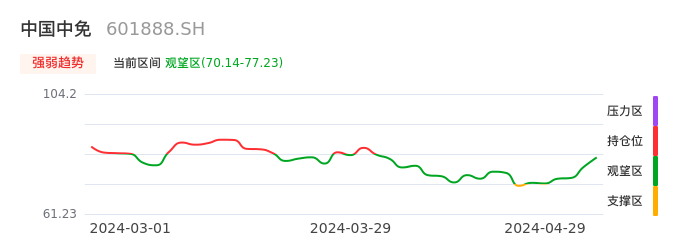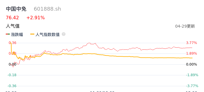 04月29日,中国中免收报76.42,股价涨幅2.91%,成交金额22.95亿元,换手率1.55%。