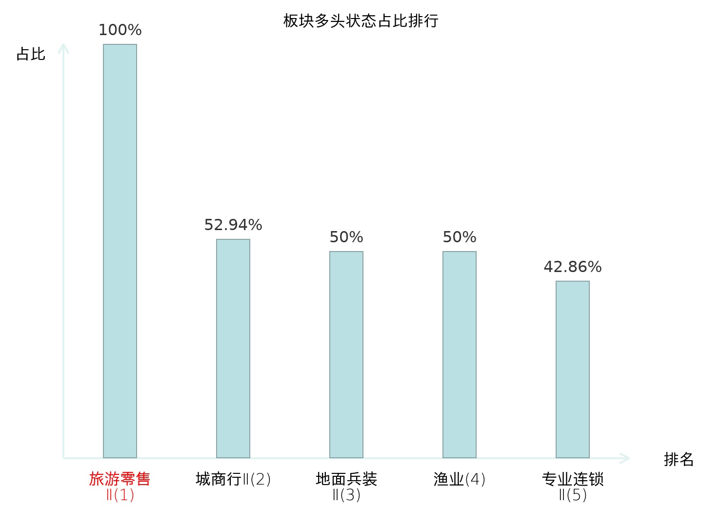 全市场所有行业板块中主力多头状态占比排名中,旅游零售Ⅱ板块位居第一。旅游及景区板块名次提升最快,较昨日上升69位。