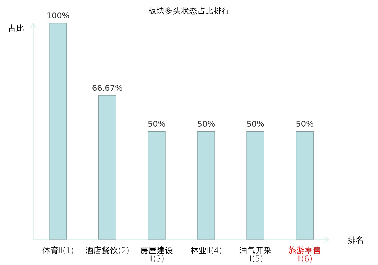 全市场所有行业板块中主力多头状态占比排名中,体育Ⅱ板块位居第一。国有大型银行Ⅱ板块名次提升最快,较昨日上升100位。