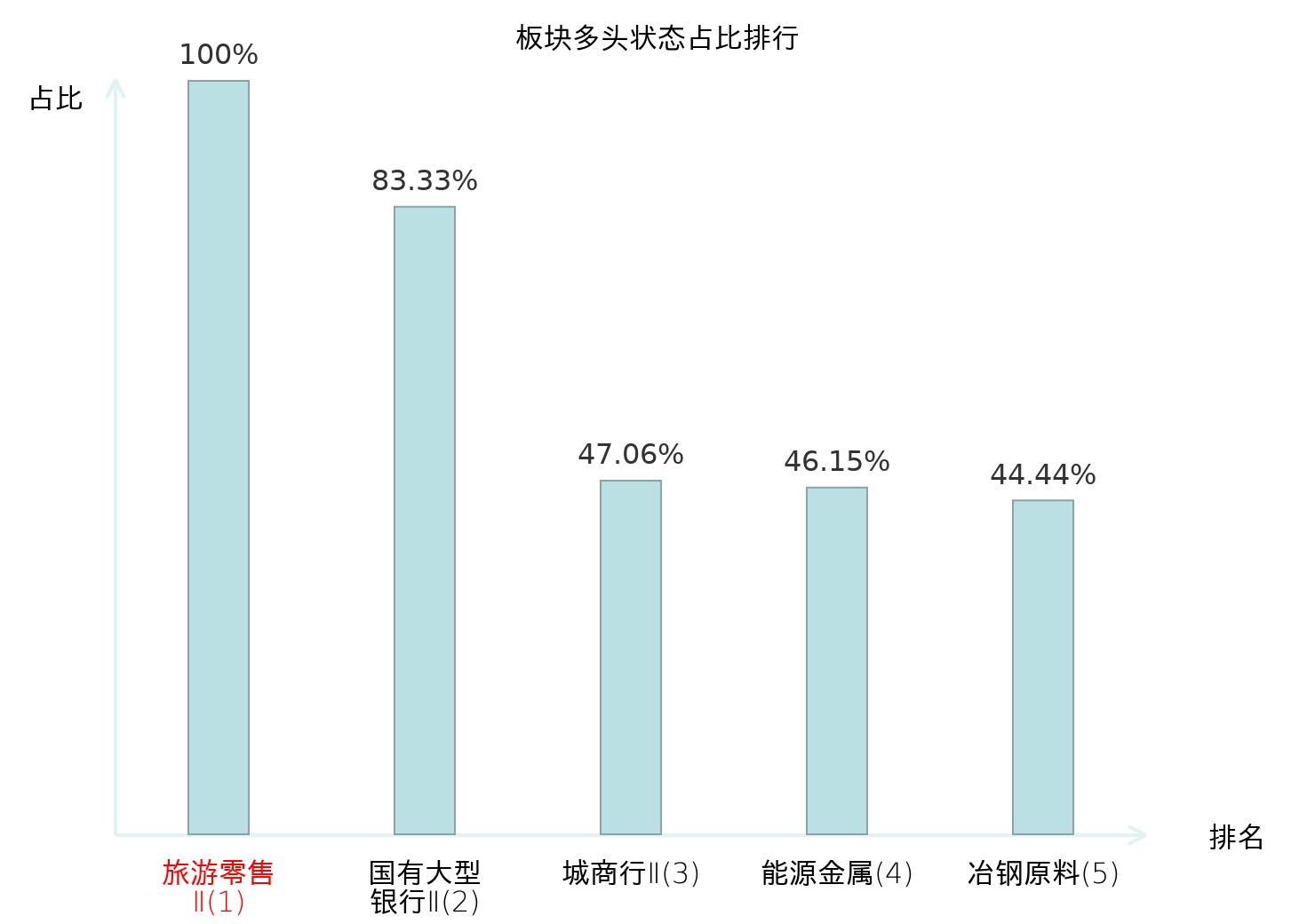 全市场所有行业板块中主力多头状态占比排名中,旅游零售Ⅱ板块位居第一。照明设备Ⅱ板块名次提升最快,较昨日上升59位。