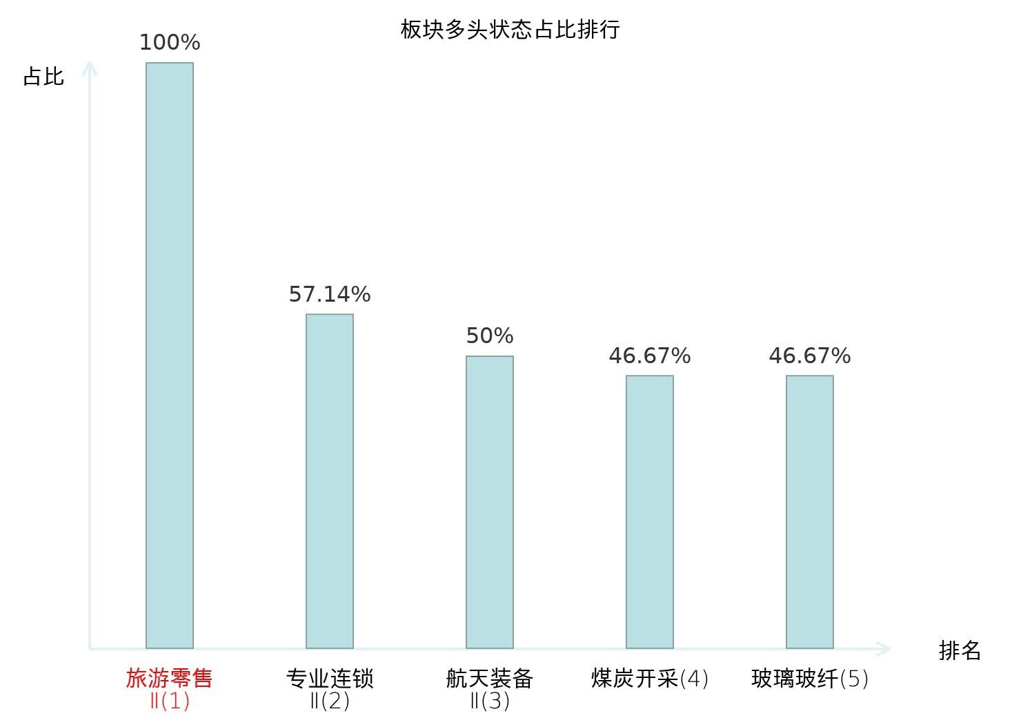 全市场所有行业板块中主力多头状态占比排名中,旅游零售Ⅱ板块位居第一。普钢板块名次提升最快,较昨日上升64位。