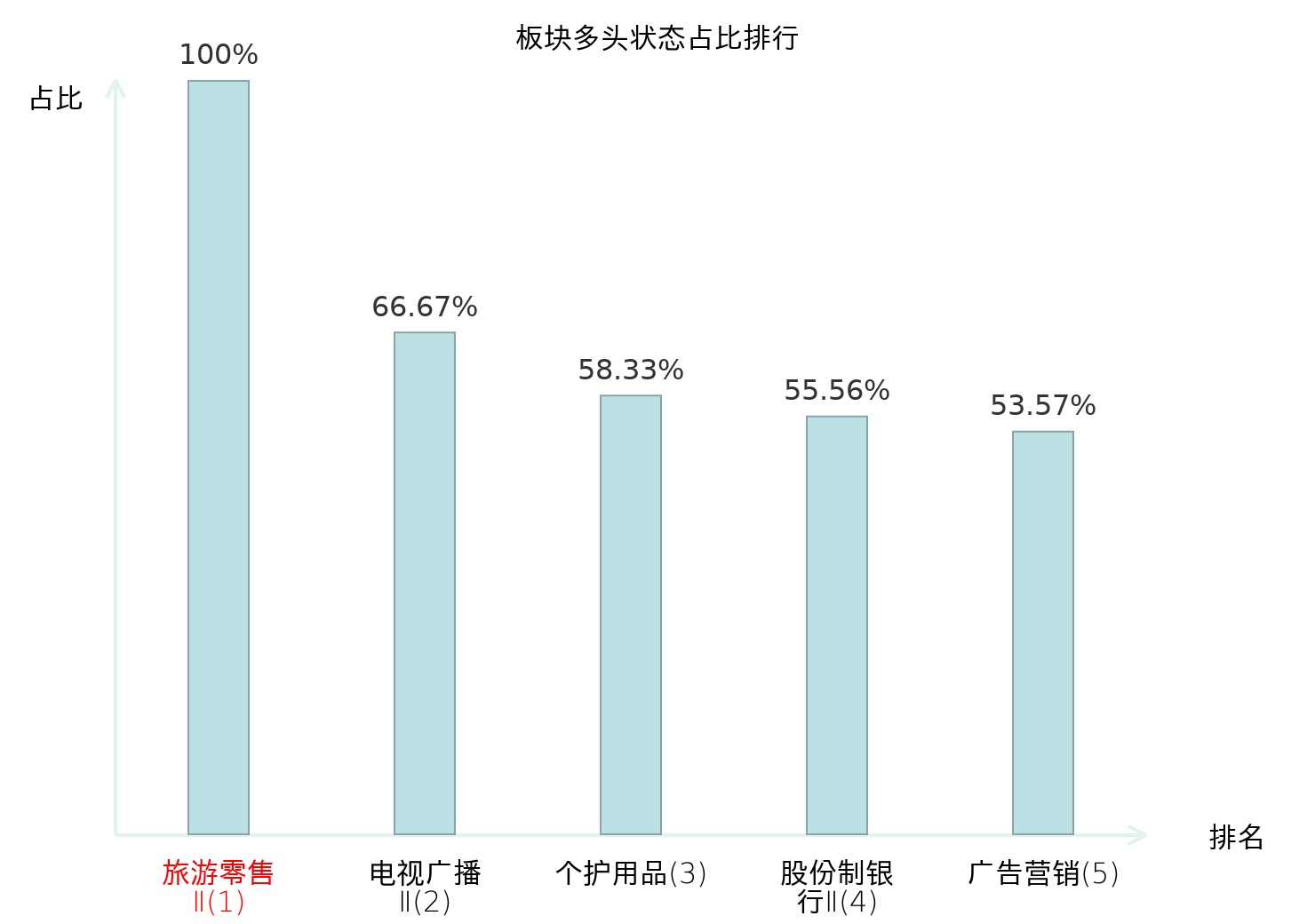 全市场所有行业板块中主力多头状态占比排名中,旅游零售Ⅱ板块位居第一。国有大型银行Ⅱ板块名次提升最快,较昨日上升106位。