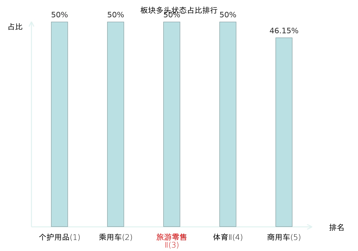全市场所有行业板块中主力多头状态占比排名中,个护用品板块位居第一。林业Ⅱ板块名次提升最快,较昨日上升94位。