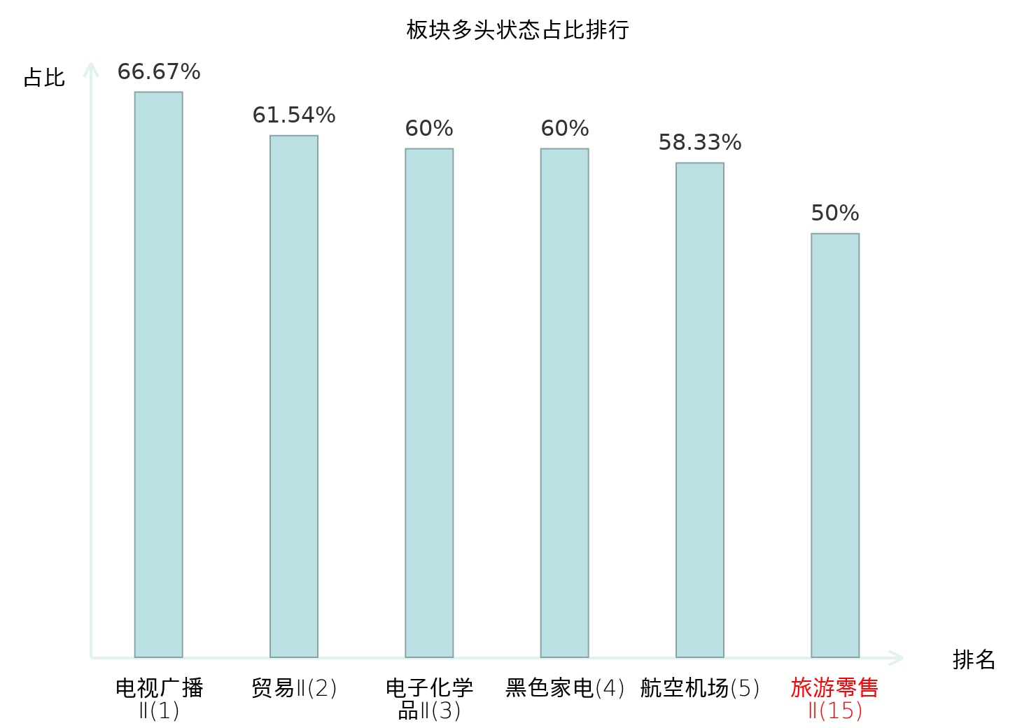 全市场所有行业板块中主力多头状态占比排名中,电视广播Ⅱ板块位居第一。黑色家电板块名次提升最快,较昨日上升80位。