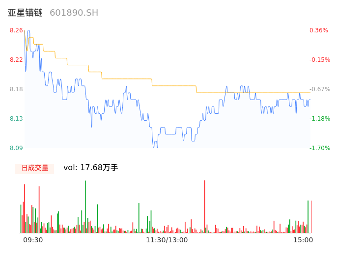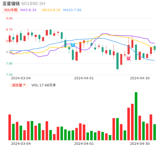 04月30日,亚星锚链收报8.16,股价涨幅-0.85%,成交金额1.44亿元,换手率1.84%。