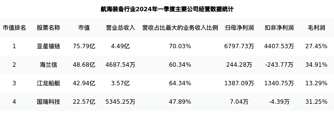 亚星锚链最新报告期数据为一季度,下表汇总了航海装备行业内市值靠前的公司一季度主要经营数据