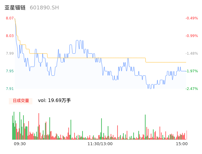 04月25日,亚星锚链收报7.95,股价涨幅-1.97%,成交金额1.57亿元,换手率2.05%。