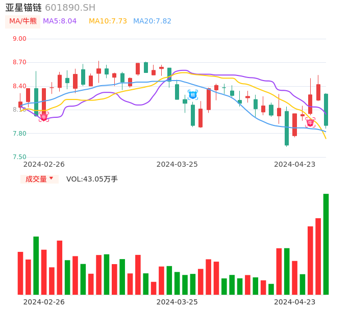 04月23日,亚星锚链收报7.90,股价涨幅-6.18%,成交金额3.44亿元,换手率4.49%。