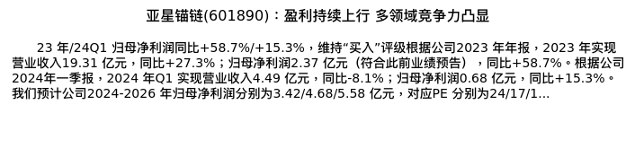 值得注意的是:2024年04月华泰证券的倪正洋/邵玉豪分析师,首次发布关于亚星锚链的研究报告,标题为:亚星锚链(601890):盈利持续上行 多领域竞争力凸显。