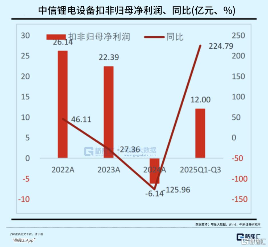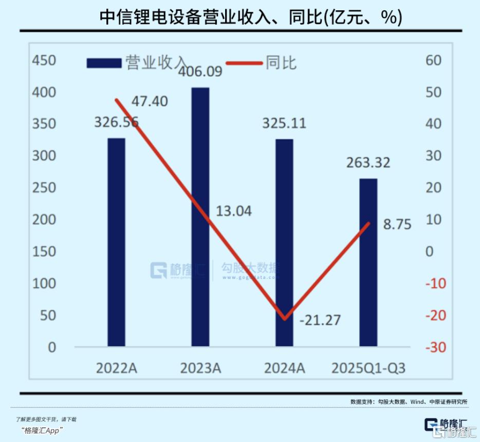 据2025年三季报数据,中信锂电设备行业营收规模达263.32亿元,同比增长8.75%;扣非归母净利润12亿元,同比实现大幅扭亏。