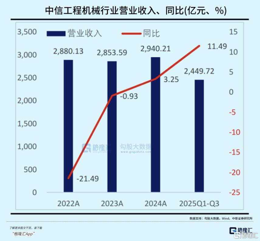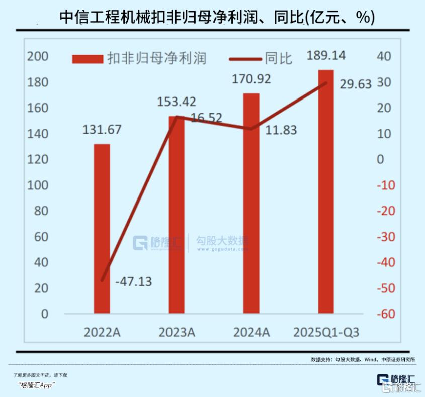 2025年三季度,中信工程机械行业营收达2449.72亿元、同比增11.49%,扣非归母净利润189.14亿元、同比增29.63%,两项增速环比均明显提升,行业经营与盈利持续向好。