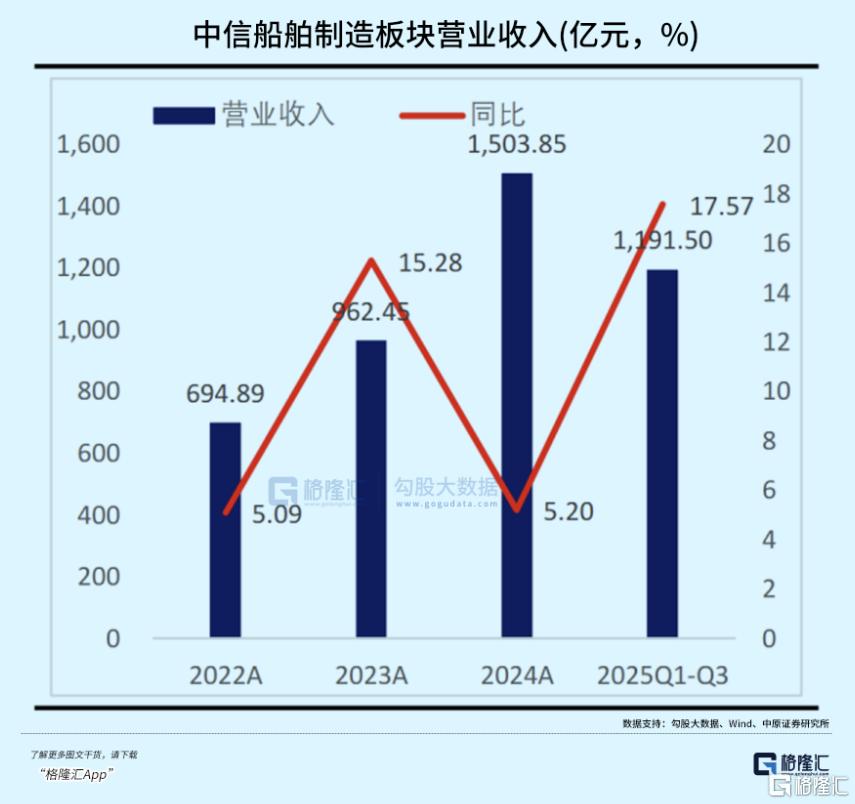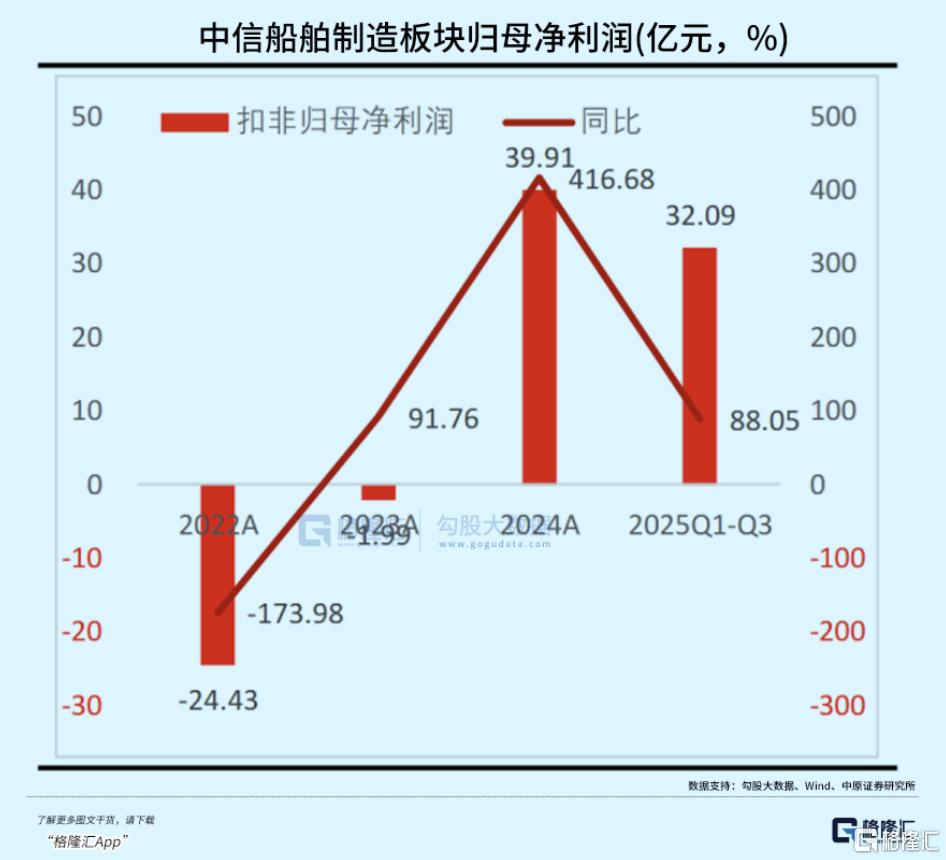 2025年三季报显示,中信船舶制造行业营收规模达1191.5亿元,同比增长17.57%;扣非归母净利润32.09亿元,同比大幅增长88.5%,业绩增长态势显著,从新造船完工量实现稳健增长来看,手持订单仍保持较快增速,行业景气度延续向好态势,企业盈利修复进程加速。