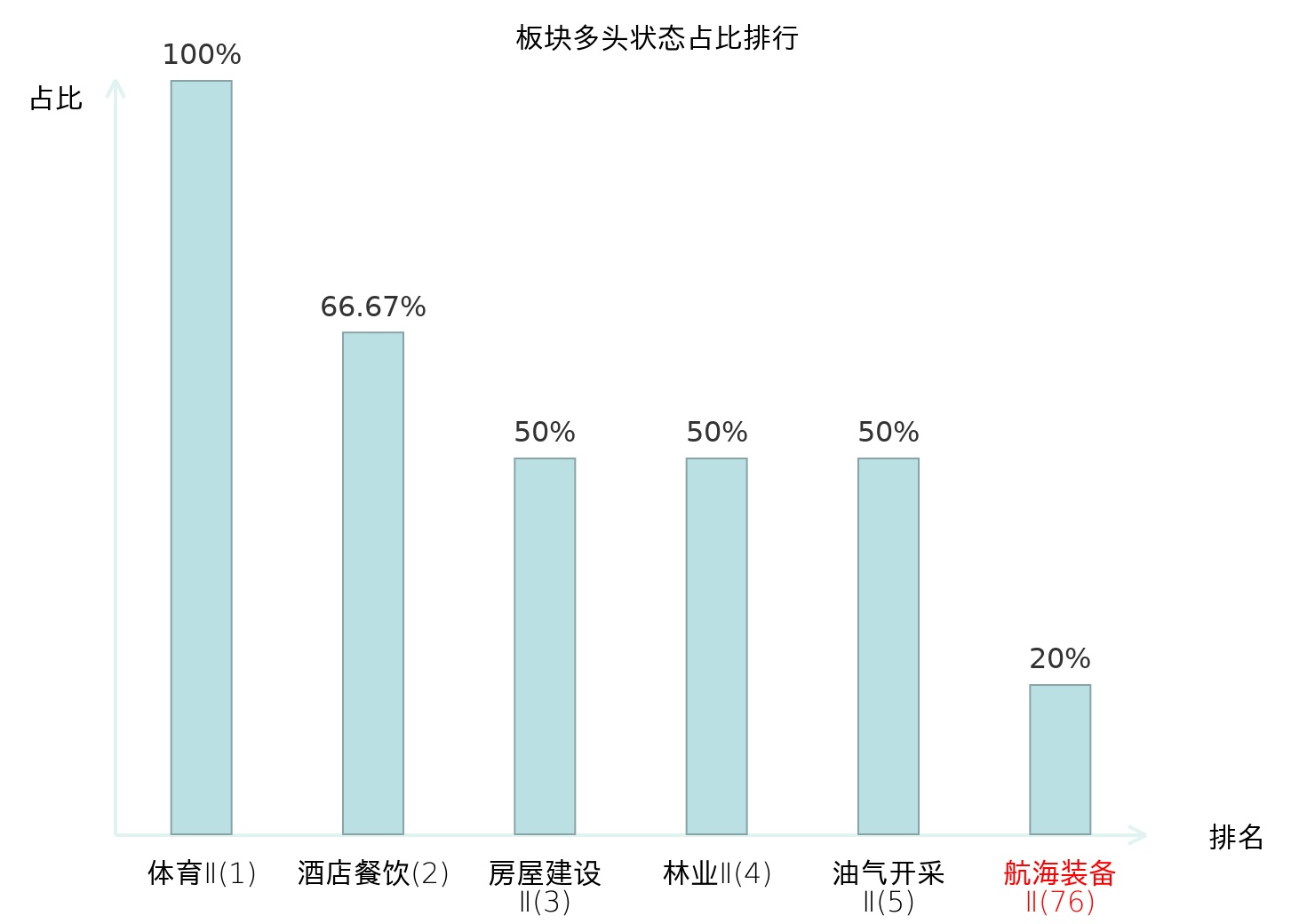 全市场所有行业板块中主力多头状态占比排名中,体育Ⅱ板块位居第一。国有大型银行Ⅱ板块名次提升最快,较昨日上升100位。
