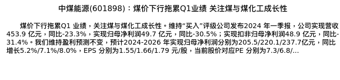 值得注意的是:2024年04月开源证券的张绪成分析师,首次发布关于中煤能源的研究报告,标题为:中煤能源(601898):煤价下行拖累Q1业绩 关注煤与煤化工成长性。