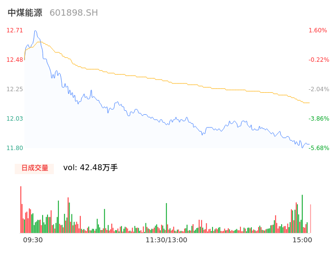 04月22日,中煤能源收报11.83,股价涨幅-5.44%,成交金额5.16亿元,换手率0.46%。