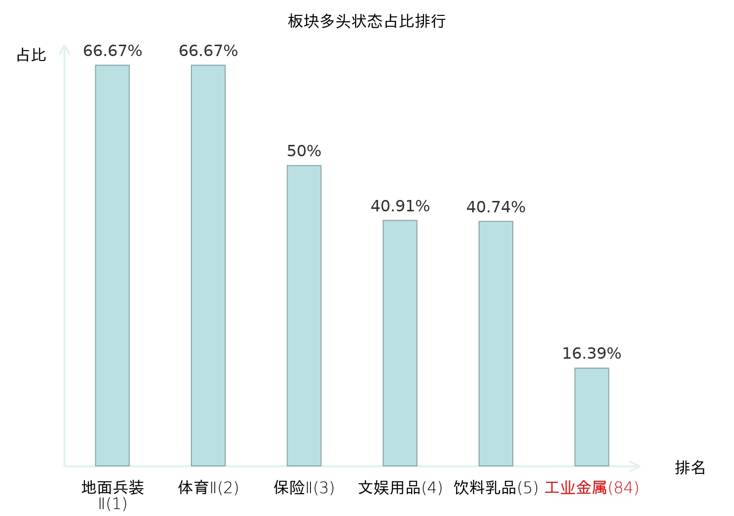 全市场所有行业板块中主力多头状态占比排名中,地面兵装Ⅱ板块位居第一。电视广播Ⅱ板块名次提升最快,较昨日上升82位。
