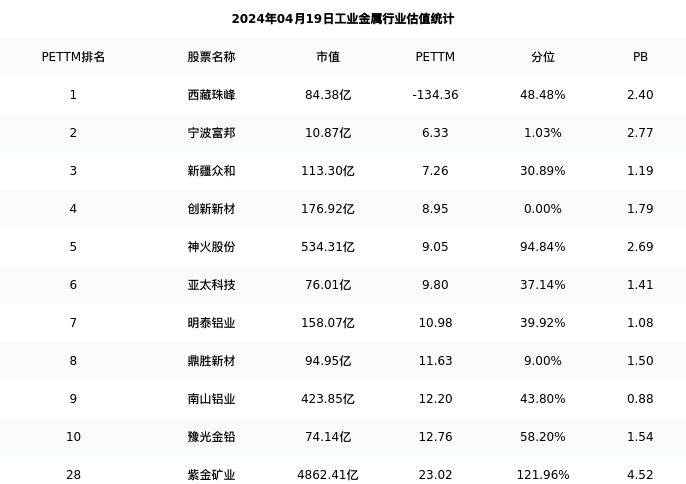 从估值角度看:紫金矿业最新市盈率PETTM为23.02,在行业内排名27/59,处于121.96分位。