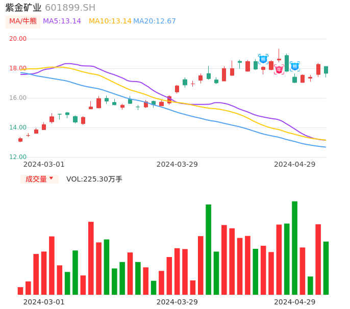 值得注意的是:2024年04月中信建投证券的王介超分析师,首次发布关于紫金矿业的研究报告,标题为:紫金矿业(601899):矿产铜金量价齐升+成本环比显著下降 公司实现开门红。
