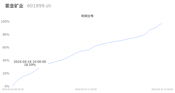 601899紫金矿业2024年04月16日成交208.22万手,成交金额37.91亿元,相较昨日缩量30.38万手,换手率1.01%,成交清淡。