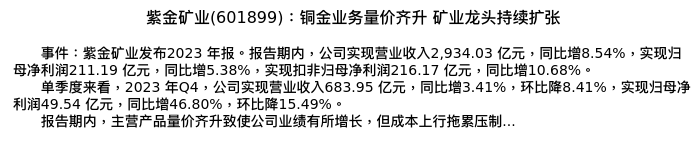 值得注意的是:2024年04月中泰证券的郭中伟/谢鸿鹤/陈沁一分析师,首次发布关于紫金矿业的研究报告,标题为:紫金矿业(601899):铜金业务量价齐升 矿业龙头持续扩张。