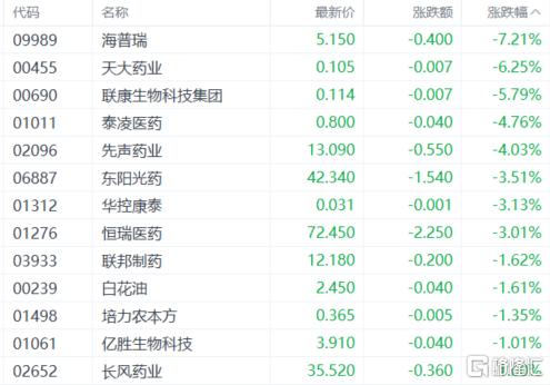 药品板块下挫,海普瑞跌超7%,先声药业、东阳光药、恒瑞医药、联邦制药等跟跌。